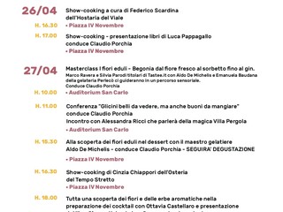Dopo il successo della prima giornata con gli show cooking degli Chef Federico Scardina e Luca Pappagallo il Festival della Cucina con i Fiori, evento promosso dal comune di Albenga in collaborazione con l’associazione Ristoranti della Tavolozza, propone un ricco programma per oggi domenica 27/04