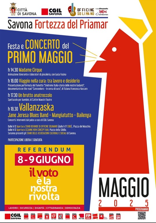 Alle 18.30 inizieranno i concerti "Il voto è la nostra rivolta" con Jane Jeresa Blue Band, Mangiatutto e Bailenga e infine i Vallanzaska, con interventi dal palco della Cgil Savona.