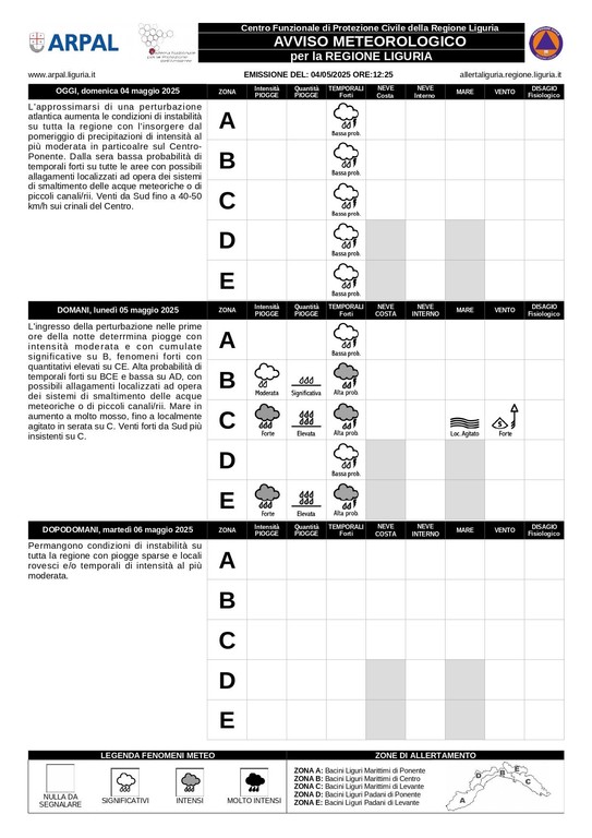 Le previsioni per le prossime ore nel bollettino emesso da Arpal