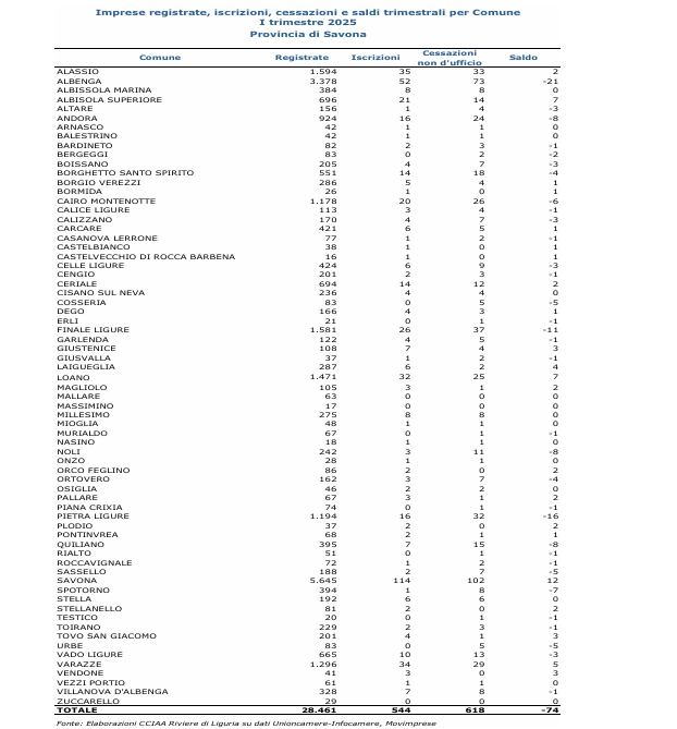 E' il quadro che emerge dall’analisi della Camera di Commercio Riviere di Liguria sui dati Movimprese che, in relazione al primo trimestre 2025, nella provincia savonese vede 28.461 aziende registrate agli elenchi, con un saldo negativo di 74 unità tra nuove iscrizioni e cessazioni, che corrisponde a un tasso di crescita del -0,26%.