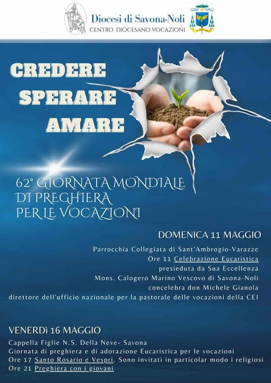 Domenica 11 maggio ricorrerà la 62esima Giornata mondiale di preghiera per le vocazioni. Alle ore 11 nella Collegiata Sant'Ambrogio a Varazze il vescovo della diocesi di Savona-Noli monsignor Calogero Marino presiederà la messa. Concelebrerà don Michele Gianola, direttore dell'Ufficio Nazionale per la Pastorale delle Vocazioni della Conferenza Episcopale Italiana.