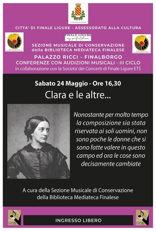 Il titolo dell’incontro è “Clara e le altre…”, un omaggio a Clara Schumann (1819–1896), straordinaria pianista e moglie del celebre Robert, nonché autrice di composizioni di grande valore artistico. La conferenza sarà dedicata alle donne compositrici, protagoniste spesso dimenticate della storia della musica, che nel tempo hanno saputo farsi strada in un mondo a lungo dominato dagli uomini.