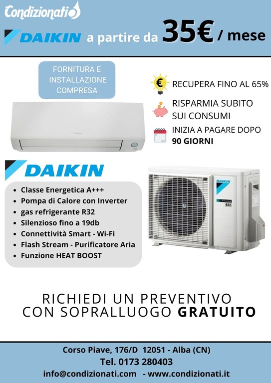 Condizionati, azienda leader nella climatizzazione residenziale e commerciale, propone due offerte imperdibili per l’estate 2025: climatizzatori Daikin e Mitsubishi Electric con installazione inclusa a partire rispettivamente da 35€ e 33€ al mese. Il tutto con detrazioni fiscali fino al 50%, risparmio energetico immediato e possibilità di iniziare a pagare dopo 90 giorni.