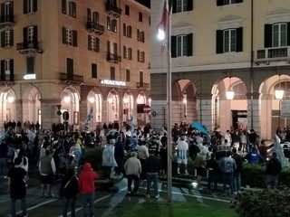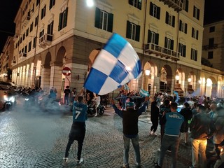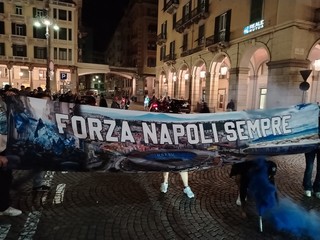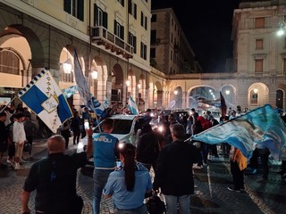 In una porzione di Piazza Mameli lato via Paleocapa i supporter di Lukaku, McTominay, Di Lorenzo e degli altri calciatori della rosa napoletana, hanno condiviso la loro gioia celebrando l'atteso scudetto con cori, caroselli, bandiere al cielo e qualche fuoco d'artificio.