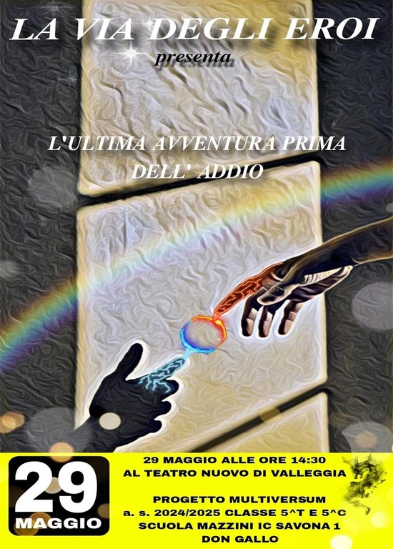 Giovedì 29 maggio, alle 14:30, andrà in scena al Teatro Nuovo di Valleggia “L’ultima avventura prima dell’addio”, terzo e ultimo capitolo della saga La via degli Eroi, spettacolo teatrale creato, scritto e interpretato dalle classi 5ªC e 5ªT della scuola primaria “Mazzini” di via Verdi, parte dell’I.C. Savona 1 “Don Gallo”.