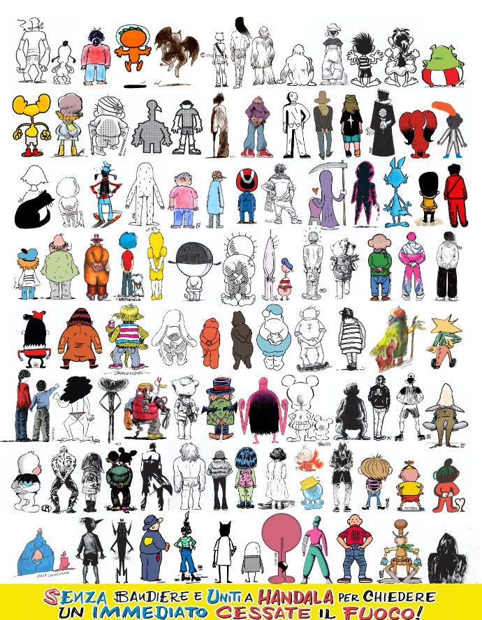 Il poster dell’iniziativa “Uniti a Handala per chiedere un immediato cessate il fuoco: 104 personaggi di 80 autori e autrici diversi”