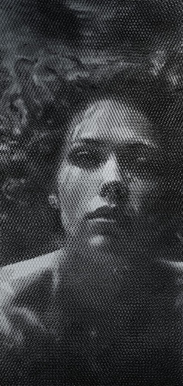 Mageia è incanto e veleno, bellezza che avvince e confonde. Il volto sorge dalla trama come un sortilegio intessuto d’ombra e luce, e il metallo specchiante ne amplifica il sortilegio, trasmutando lo sguardo in seduzione senza scampo. La Sirena in Mageia non chiede di essere compresa, ma temuta. È la figura che ammalia con dolcezza e spaesamento, e che nel momento stesso in cui appare, sfugge. Il volto si rivela nella rete come in un sortilegio visivo, al tempo stesso concreto ed evanescente. La trama metallica diventa tessitura di un incantesimo visivo che attira lo spettatore dentro un gioco di rimandi: chi guarda, è guardato. Il fondale d’acciaio riflette, ma distorce, coinvolgendo direttamente chi si avvicina all’opera. Mageia è un meccanismo di seduzione sottile e inevitabile, dove la bellezza si fa trappola, la luce inganno, e l’immagine promessa. La Sirena non è più solo mito, ma uno specchio che svela la vulnerabilità di chi si lascia attrarre. In questo intreccio di luce e ombra, ogni certezza si dissolve nel desiderio.