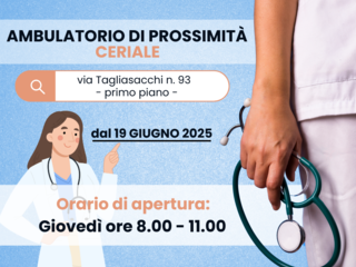 Da giovedì 19 giugno Asl 2 apre l’ambulatorio di prossimità nel Comune di Ceriale. L’ambulatorio avrà sede in via Tagliasacchi 93, al primo piano, e sarà operativo tutti i giovedì dalle ore 8.00 alle 11.00.