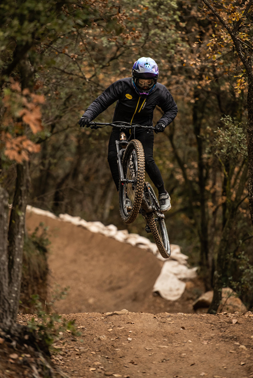 Prima tappa Barcellona, dove abbiamo visitato il leggendario La Poma Bike Park. È un luogo iconico per chi pratica dirt jump, una disciplina della mountain bike che consiste nell’eseguire salti e acrobazie su rampe di terra. Entrare lì è stato come vivere un sogno: bambini, atleti pro e molte ragazze che si allenavano insieme. Ho percepito un ambiente davvero inclusivo e stimolante. L’emozione era così forte che per le prime due ore non sono riuscita nemmeno a salire in bici, poi non sarei più scesa dalla sella! Ma, uno dei momenti che non posso dimenticare è stata l’avventura nel deserto del Teruel. Viaggiavamo di notte e siamo arrivati con una fitta nebbia. Al mattino, con il sorgere del sole, davanti a noi si è aperto uno scenario straordinario: rocce friabili, canyon scolpiti dal vento, colori caldi che sfumavano dal marrone al crema. Ci siamo messi subito al lavoro: con Ivan abbiamo esplorato il terreno per costruire delle linea di freeride, ovvero un percorso non tracciato che il rider disegna autonomamente sfruttando le forme del paesaggio. Io, oltre a essere biker, sono anche trail builder — realizzo e mantengo sentieri per la mountain bike — quindi per me è stato davvero entusiasmante trovarmi in un luogo così unico. In quel paesaggio quasi lunare, circondati da rapaci che volteggiavano sopra di noi, ho percepito una connessione fortissima con l’ambiente.