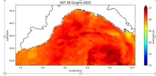 Secondo i dati di ieri, 26 giugno, sono presenti valori di temperatura diffusamente superiori ai 26 °C e localmente anche superiori ai 27 °C, in particolare sul settore al largo dello spezzino.