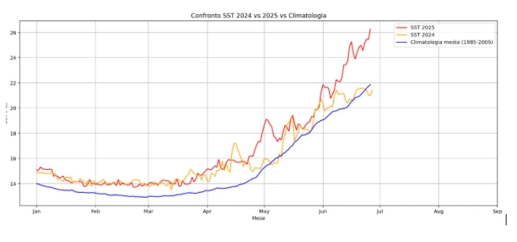 È stato inoltre messo a confronto l’andamento della temperatura superficiale media dal 1 gennaio al 26 giugno 2025 confrontati con i dati del 2024 e con i valori climatologici di riferimento del periodo 1985-2005 per lo stesso periodo.