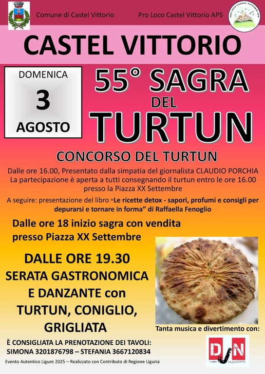 A Castel Vittorio fervono i preparativi per la 55ª edizione della Sagra del Turtun, in programma domenica 3 agosto. Un evento molto atteso, che ogni anno richiama curiosi, buongustai e amanti della tradizione. L’evento è stato riconosciuto come evento autentico ligure ed è sostenuto dal contributo di regione Liguria- Assessorato al Turismo