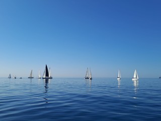 Ai blocchi di partenza si sono schierate dodici imbarcazioni, in un mare “ultrapiatto”, con le vele svettanti nel cielo azzurro.