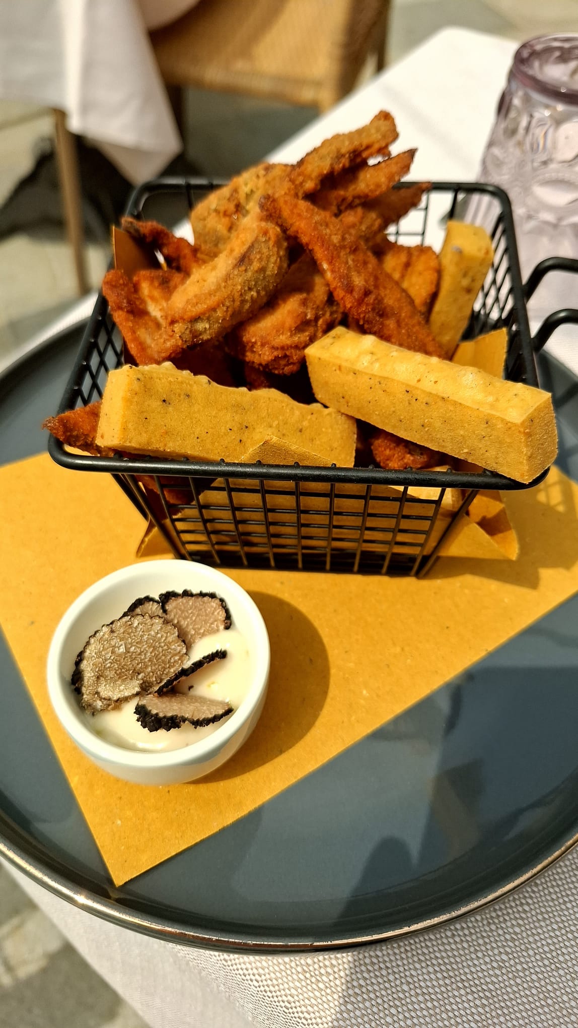 - una composizione di acciughe impanate fritte con carciofo spinoso d’Albenga e panissa ligure al tartufo nero, da intingere in una maionese vegana con lime e bis di acciughe e tartufo: uno street food elegante, che racconta la Riviera con una croccantezza golosa e una nota umami profonda.