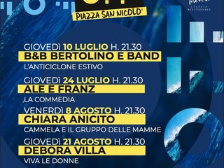 Prossimi appuntamenti: giovedì 24 luglio, Ale&Franz con "La Commedia", giovedì 8 agosto, Chiara Anicito con "Cammela e il gruppo delle mamme" e giovedì 21 agosto Debora Villa con "Viva le donne".