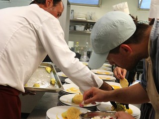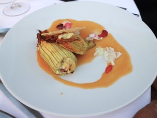 · Fiori di zucca farciti con ricotta e maggiorana, accompagnati da petali di Bocca di Leone, cremoso al datterino giallo e cialda croccante di Parmigiano Reggiano