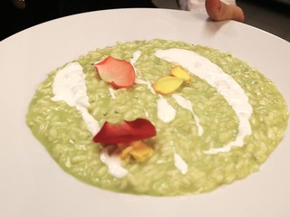 · Risotto mantecato con purea di zucchine trombetta al profumo di Nasturzio, spuma leggera di burrata e petali di Begonia