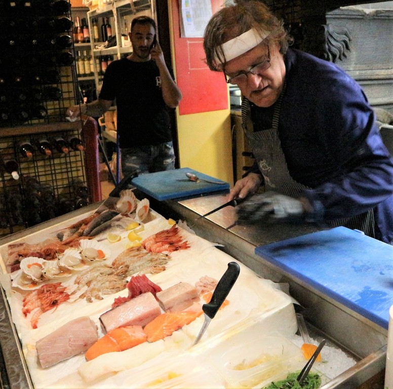 Al timone della cucina c’è Mauro, chef e titolare appassionato, sempre all’opera dietro il banco centrale su cui campeggia una cascata di ghiaccio colma di pesce freschissimo, prevalentemente locale. Accanto a lui, Svetlana, sorridente padrona di casa, accompagna i clienti consigliando con cura gli abbinamenti migliori tra piatti e vini.