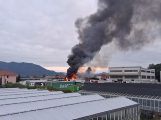 Le fiamme hanno interessato un capannone della ditta Gallo Trasporti, sollevando una densa coltre di fumo nero visibile anche da lontano.
