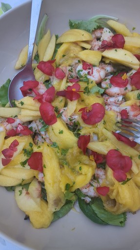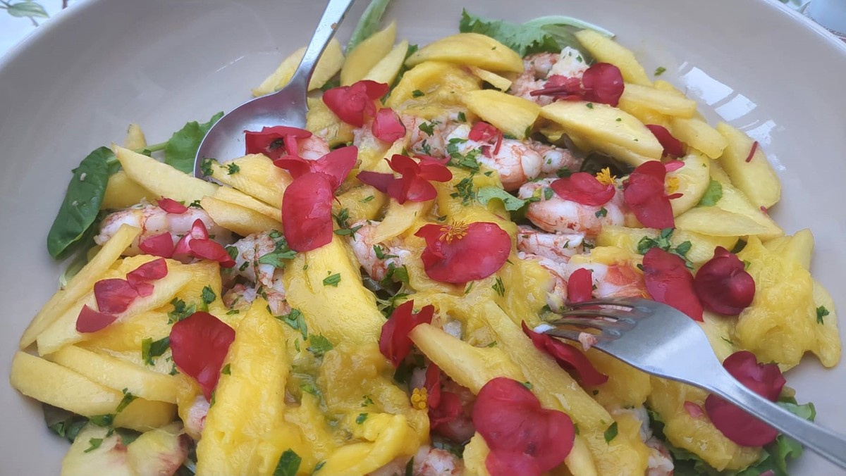 Taglia mango e pesca a cubetti e riuniscili in una ciotola insieme ai gamberi cotti. Condisci con un filo d’olio extravergine, qualche goccia di lime e un pizzico di sale. Aggiungi i fiori di begonia, spezzettati delicatamente con le mani, e completa con menta fresca o basilico per un tocco erbaceo. Servi questa insalata fredda o a temperatura ambiente: è perfetta come antipasto elegante o piatto unico leggero nelle giornate più calde.