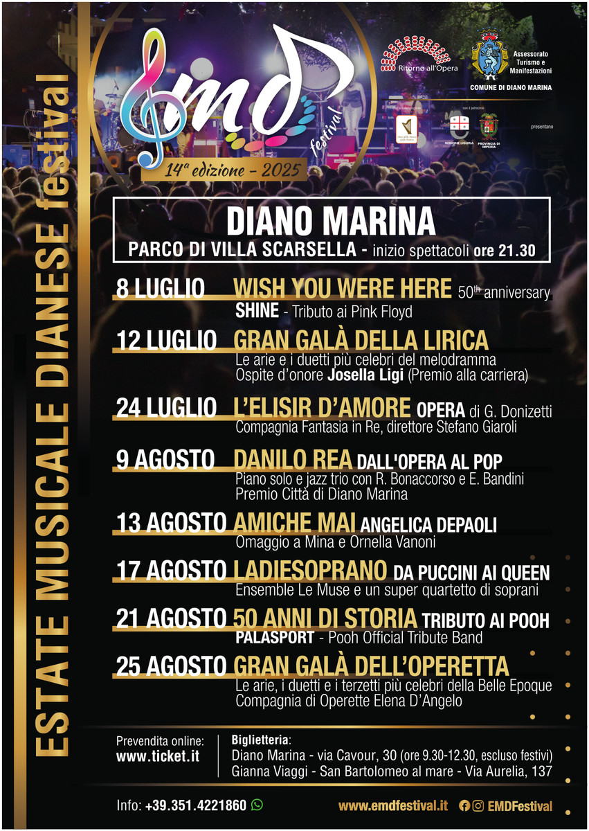 E’ un agosto a cinque stelle - tante sono le serate ancora in cartellone per il 14° Emd Festival – a Diano Marina. Nella splendida cornice del parco di Villa Scarsella, vero e proprio teatro all’aperto, tra il 9 e il 25 agosto ci attende una programmazione di altissimo livello in quello che è il periodo più vacanziero dell’anno. Cinque spettacoli per soddisfare un pubblico eterogeneo e i tanti cultori dell’arte musicale. Protagonisti sono artisti di caratura nazionale e internazionale e gruppi di eccellenza, tra talento, passione e bellezza, nell’ambito di un festival che dal 2012, svariando tra i vari generi musicali, regala grandi emozioni.