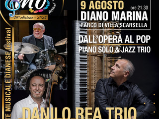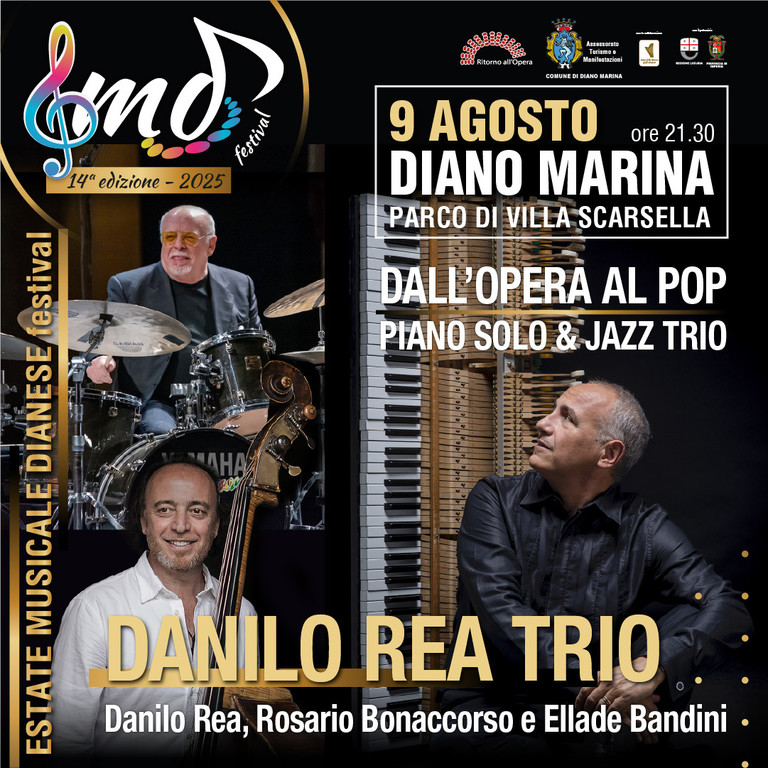 Una serata straordinaria, imperdibile, con uno dei più grandi pianisti jazz del panorama mondiale: Danilo Rea. In apertura in piano solo, poi in trio con il contrabbassista Rosario Bonaccorso e il batterista Ellade Bandini, altri due super musicisti, per un concerto che spazia dall’opera al pop, in chiave jazz. Rea, artista raffinato e amatissimo, è stato al fianco di Gino Paoli, Mina, Riccardo Cocciante e tanti altri big. A Diano Marina Rea, con i suoi due partner, propone un percorso musicale inedito, nel quale le note del suo pianoforte evocano in una narrazione artistica di grande impatto culturale e poetico le arie dei grandi compositori italiani, famose in tutto il mondo, come Puccini, Rossini, Verdi, Bellini, Donizetti e le melodie intramontabili di Fabrizio De André, dei Beatles e altri notissimi brani. Sabato sera Rea riceverà il Premio Città di Diano Marina, riconoscimento che annualmente (nel 2024 è toccato a Tullio De Piscopo) viene consegnato ad un’icona dello spettacolo al termine della sua esibizione sul palco di Villa Scarsella.
