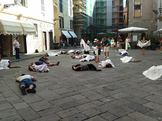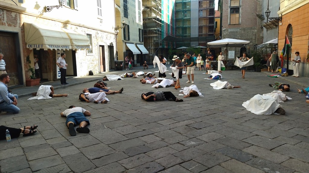 L’iniziativa simbolica si è svolta questo pomeriggio alle 18 e ha visto una trentina di persone, al suono di una sirena e al rumore dello scoppio di bombe, sdraiarsi a terra, coperte da un lenzuolo bianco, mentre altre tutt'intorno reggevano cartelli e striscioni con le scritte “Palestina libera” e “Fermiamo il genocidio”.