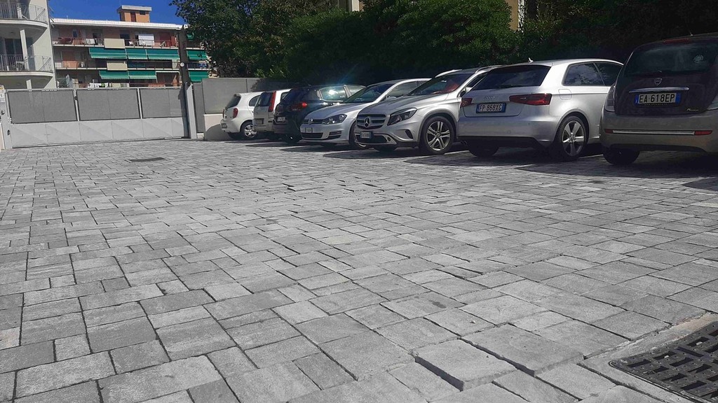 La pavimentazione del parcheggio è da tempo traballante e pericolosa, soprattutto in relazione con il continuo via vai di auto e relativi automobilisti che usufruiscono del parcheggio.