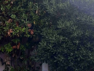 L'illuminazione pubblica alla destra del parcheggio è completamente oscurata dalle folte chiome degli alberi che nessuno da tempo sta curando.