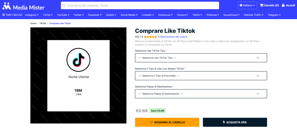Media Mister è un’ottima soluzione per chi vuole acquistare like TikTok reali. Scegli tu il tipo di like: per video, live, commenti o storie, così il segnale si allinea al formato che pubblichi.