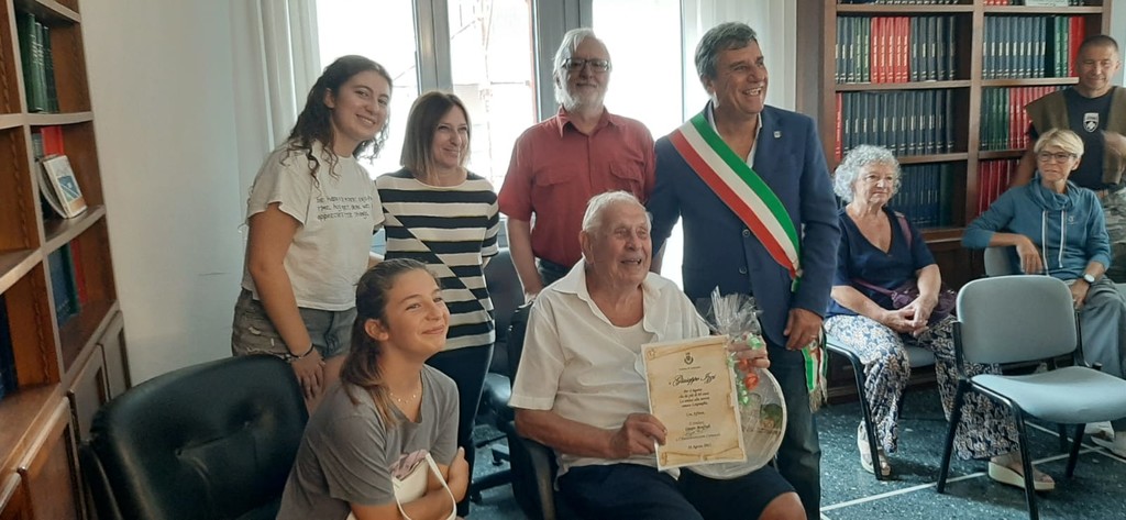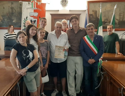 Giuseppe Izzi, 89 anni, di Torino, è stato invitato in Comune per una breve, ma partecipata, cerimonia con amici e nipoti. Il turista piemontese ha ricevuto una pergamena ricordo e un piatto con la raffigurazione di Laigueglia, realizzato dall’artista locale Graziella Frignani.