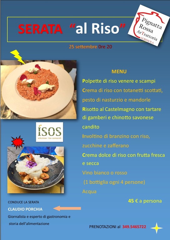 La rassegna si apre il 25 settembere con una serata dedicata al riso, uno degli ingredienti più versatili e amati della cucina italiana. La chef Tiziana Piras proporrà un percorso gastronomico che ne esplora consistenze e aromi, dai grandi classici alle interpretazioni più creative, utilizzando il riso Carnaroli selezione Isos dell’azienda di Andrea Bianchi, ospite della serata.