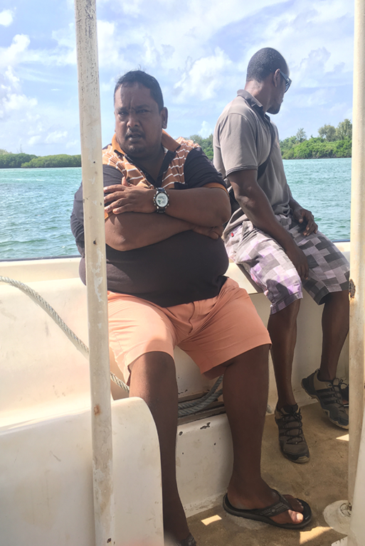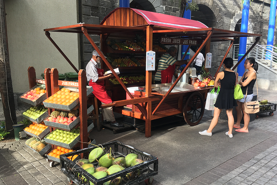 Dopo la montagna, si torna al mare. Un’escursione su una piccola barca bianca, con un tetto di lamiera decorato di foglie di palma, ci trasporta tra isolotti e mangrovie. L’acqua cambia colore di continuo: verde smeraldo vicino alla riva, azzurro intenso nelle aperture più profonde. A bordo, anche uomini e donne del posto, abituati a quel paesaggio che per noi è una scoperta continua. C’è chi osserva l’acqua, chi incrocia le braccia e fissa l’orizzonte, come se il mare fosse un libro già letto mille volte. Noi, invece, non smettiamo di sfogliarlo. L’isola è anche un mosaico di culture che convivono ogni giorno. Lo si percepisce a Port Louis, la capitale, con le sue strade caotiche e il miscuglio di lingue, volti e profumi. Un carretto di legno, con insegne in francese e inglese, offre succo di frutta appena spremuto. In fila, turisti e abitanti si mescolano senza distinzione: cocchi verdi, ananas, papaie e manghi vengono affettati al momento, trasformati in bicchieri colmi di freschezza. Anche la cucina racconta l’isola: curry di pesce su foglie di banano, farata speziate, dolci di riso accanto a piatti europei. Sapori diversi che convivono senza primeggiare.