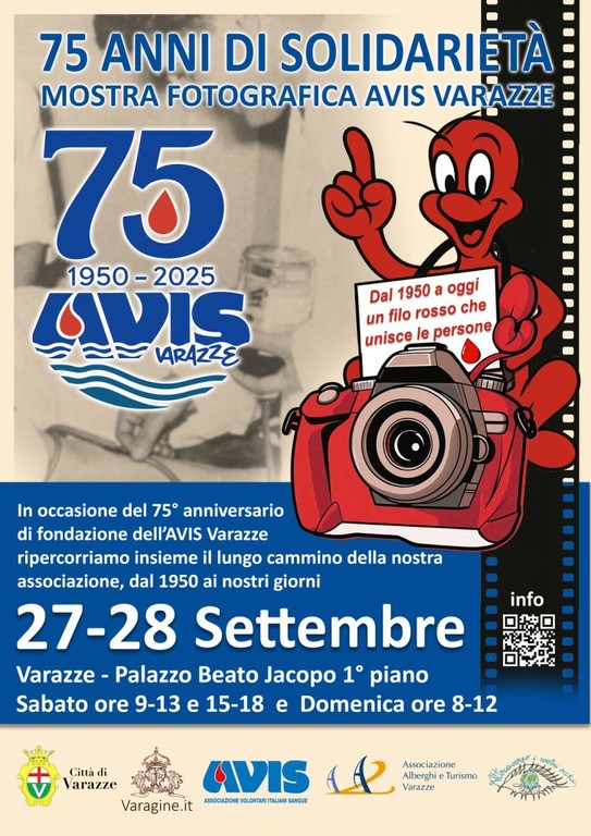 In occasione dell’anniversario Avis Varazze, sarà allestita nei locali dell’ex palazzo comunale in piazza Beato Jacopo una mostra fotografica che ripercorre il lungo cammino dell’associazione dalla fondazione ai giorni nostri. Gli orari della mostra: sabato 27 settembre ore 9-13 e 15-18 / domenica 28 settembre ore 8-12.