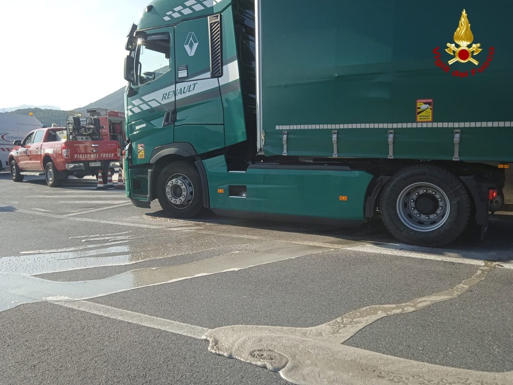 Il tir ha effettuato una brusca frenata che ha provocato la rottura di una cisterna contenente trisolfato di ferro, sostanza corrosiva, e il danneggiamento di alcuni bidoni con altri prodotti chimici