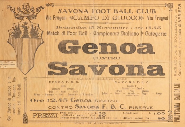 Sul sito della casa d'aste Bertolami Fineart di Roma è quindi in vendita lo storico tagliando per assistere alla partita che si era svolta domenica 15 novembre del 1914 alle 14.45 nel campo da gioco di via Frugoni a Savona che fu la casa del Vecchio Delfino fino al 1927, poi per 39 anni si spostarono nel campo di Corso Ricci per poi trasferirsi nel 1959 nello stadio Bacigalupo.