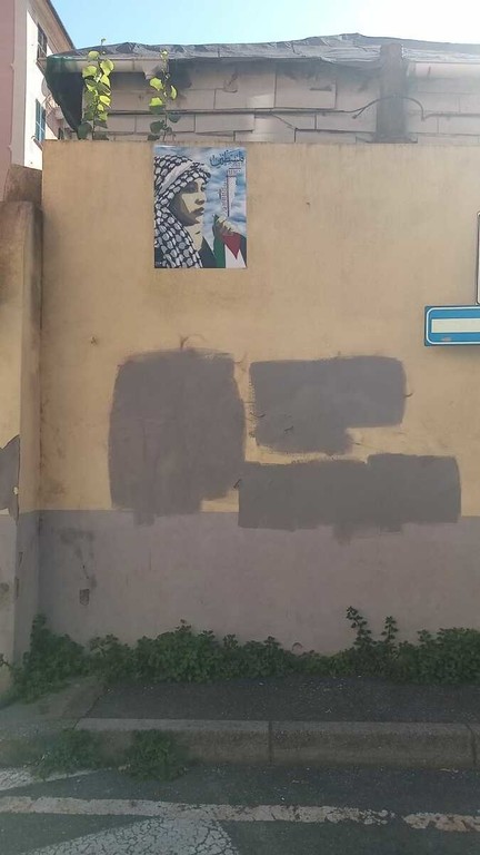 E' stato strappato il manifesto collocato su un muro che vedeva rappresentata una donna palestinese con la kefiah.