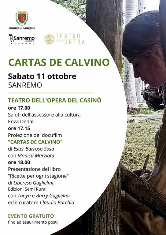 "Cartas de Calvino", diretto dalla regista Esther Barroso Sosa e con Monica Marziota nel ruolo principale, arriva finalmente a Sanremo, dopo numerose proiezioni in tutta Italia. Sarà presente alla proiezione Monica Marziota, che non è solo protagonista del docufilm, ma anche compositrice e interprete della colonna sonora originale intitolata "Se la vita fosse solo un libro". Le riprese del documentario, in omaggio allo scrittore, sono state effettuate tra Roma, Sanremo e L'Avana. Nel docufilm si potranno ammirare le immagini di Sanremo, di Villa Meridiana e del giardino di Libereso.