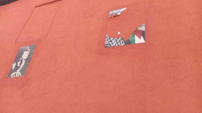 E' stato strappato il manifesto collocato su un muro che vedeva rappresentata una donna palestinese con la kefiah.