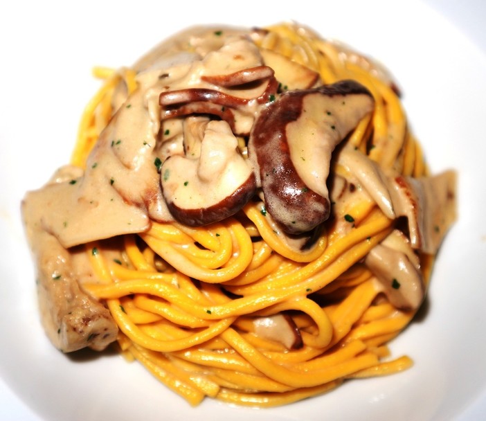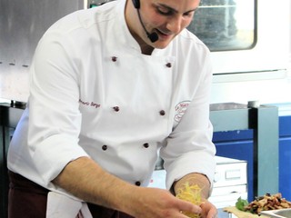Si comincia con un antipasto d’autunno servito su ardesia, omaggio alla Valle Argentina: Porcini trifolati con flan di zucca, Porcini crudi in insalata croccante e gli immancabili Porcini fritti con crema di Parmigiano, un trittico che racchiude la stagione in un solo piatto. Il primo, dei tagliolini di semola di grano duro con Porcini freschi e castagne, è una vera sinfonia di profumi e contrasti morbidi.