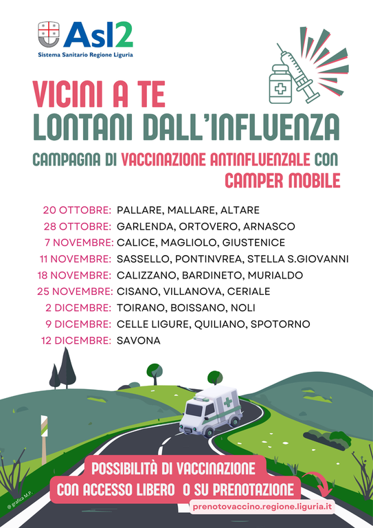 Un modello di assistenza che supera le barriere territoriali: ASL2 avvia una campagna di vaccinazione antinfluenzale con unità mobile per raggiungere direttamente la cittadinanza nelle aree più periferiche. Prima tappa lunedì 20 ottobre a Pallare, Mallare e Altare. Nove appuntamenti fino a dicembre per garantire il diritto alla prevenzione anche nei comuni più isolati, ma anche in comuni più centrali per le persone che hanno comunque difficoltà a spostarsi.