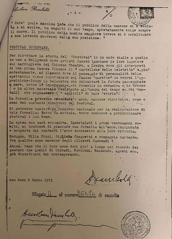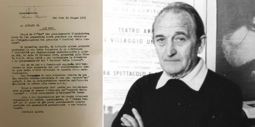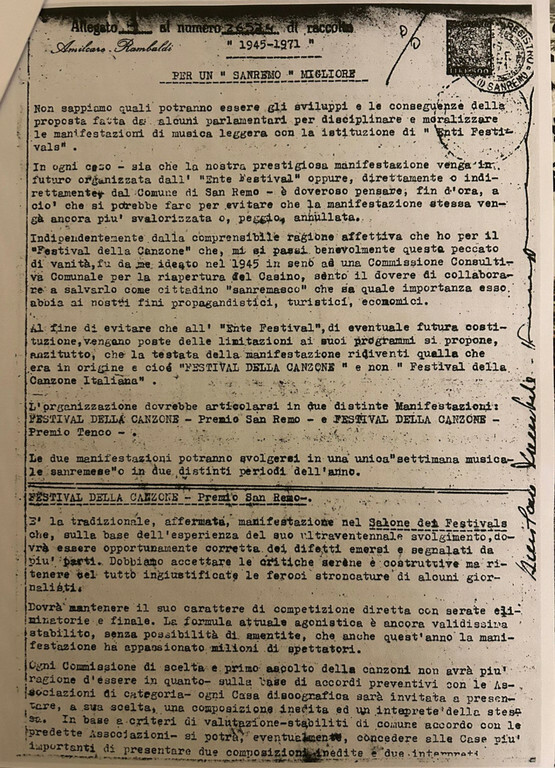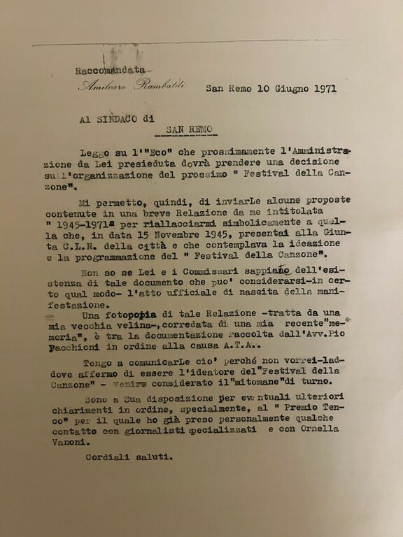 “Mi permetto di inviarLe alcune proposte contenute in una breve relazione da me intitolata 1945-1971 per riallacciarmi simbolicamente a quella che, in data 15 novembre 1945, presentai alla Giunta C.L.N. della città e che contemplava l’ideazione e la programmazione del Festival della Canzone”.