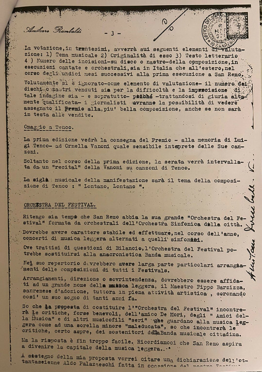 Dalle parole ai fatti. Quelle idee, vergate a macchina e firmate con l’inconfondibile calligrafia di Rambaldi, sono oggi un frammento prezioso della memoria culturale della città. A distanza di più di mezzo secolo, il Premio Tenco continua a incarnare quello spirito: un luogo di incontro, libertà e confronto, dove la canzone d’autore si fa racconto del Paese. Proprio oggi, a Sanremo, prende il via l’edizione 2025 del Premio Tenco, con i primi appuntamenti alla vigilia della tradizionale serata inaugurale di domani. Tra gli eventi in programma, anche la presentazione del volume “Amilcare Rambaldi. Dal Festival al Premio Tenco” di Luciano Barbieri, un omaggio a quell’uomo visionario che nel 1971 scriveva al sindaco Parise, convinto che “la musica potesse essere cultura, non solo intrattenimento”.