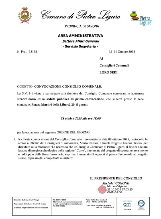 In conclusione, Carrara si sofferma sulla prevista fermata di Pietra Ligure, osservando come non debba essere realizzata: "Distruggerebbe un sito archeologico vincolato dal 2018, dove la Sovrintendenza ha attestato l’esistenza di un antico villaggio". La questione approderà in Consiglio comunale martedì 28 ottobre alle 18. L’opposizione, che ha richiesto la convocazione, auspica un voto unanime: "Non è una battaglia politica – chiosa Carrara – ma un dovere verso la nostra storia e verso le generazioni future".