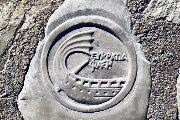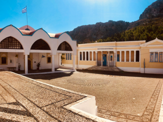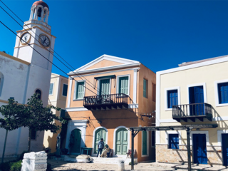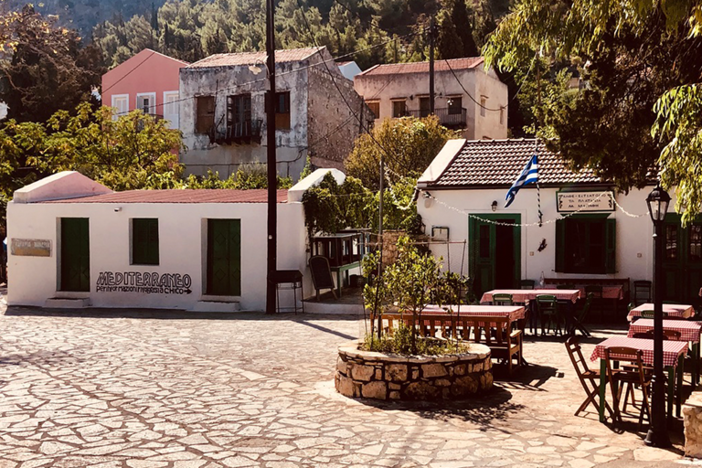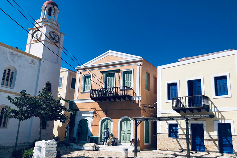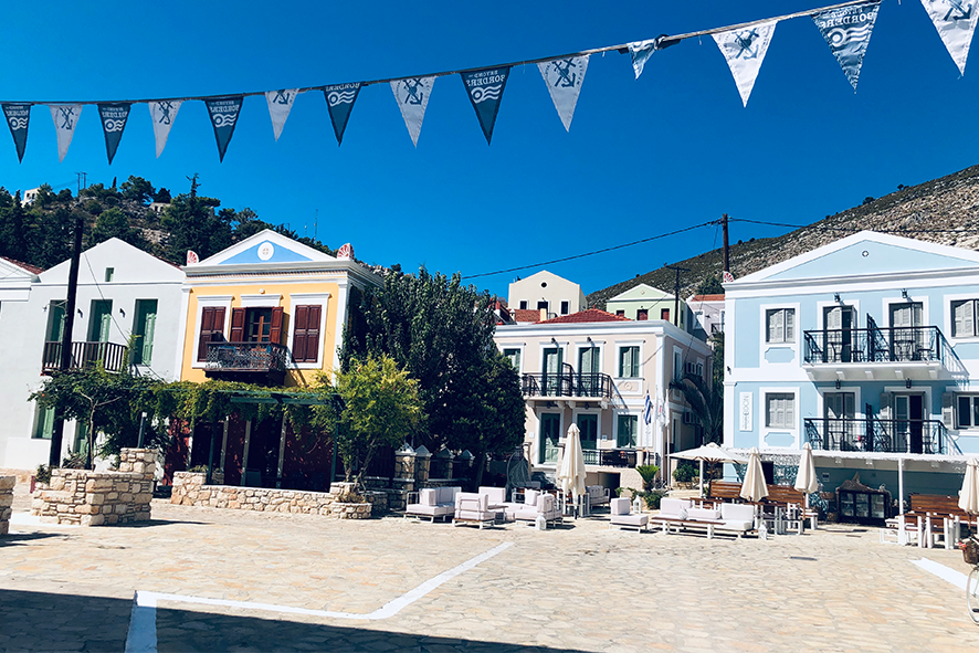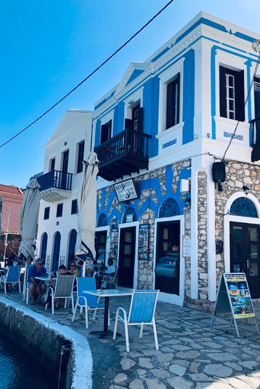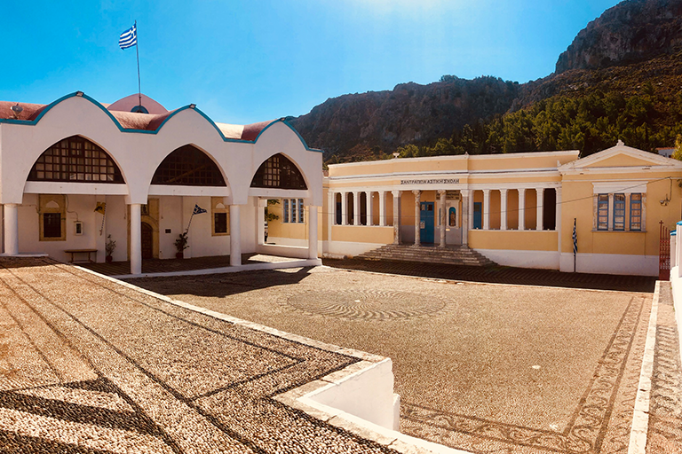 Pochi metri più in alto, una piazzetta si apre all’improvviso: tavoli di legno, un muro bianco con una sola parola scritta in nero — “Mediterraneo”. È impossibile non pensare al film di Gabriele Salvatores, girato qui e premiato con l’Oscar. Una storia di uomini sospesi tra la guerra e una terra remota che li disarma, prima ancora di accoglierli. Quella scritta non è decorazione: è memoria sedimentata, più incisiva di qualunque brochure. Attorno, muri scrostati e facciate restaurate convivono senza spiegazioni; la scena è vuota e viva allo stesso tempo, come se qualcuno dovesse comparire da un momento all’altro. Poco distante si trova la Santrapeia School, fondata nel 1903 della diaspora greca che è uno degli edifici simbolo di Kastellorizo. La sua architettura neoclassica, con colonne e timpano, testimonia il periodo di grande sviluppo a inizio Novecento, quando cultura e commercio fiorivano grazie alla posizione strategica e al momento storico. Oggi l’edificio resta un punto di riferimento solo identitario per gli abitanti.