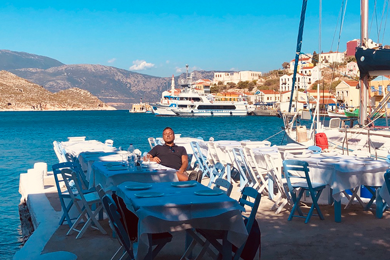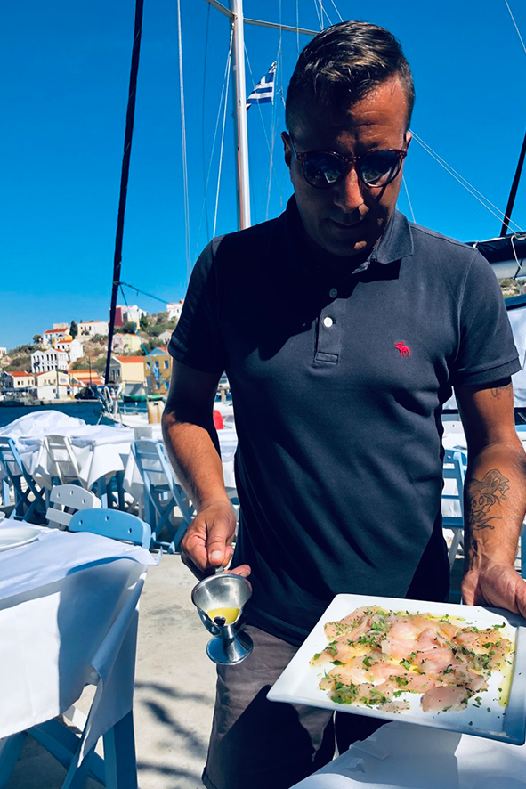 Il porto è la lente attraverso cui tutto si legge. Le imbarcazioni oscillano in un movimento continuo, e il Meltemi — vento caldo dell’Egeo — regala leggerezza ai pensieri. Le sedie rivolte al mare puntano tutte nella stessa direzione, come se l’isola avesse un’unica via di fuga: l’orizzonte. Una viaggiatrice sola, a un tavolo un po’ defilato, osserva in silenzio. Qui si guarda più di quanto si parli. Un uomo apparecchia i tavoli di una taverna: si muove piano, con la calma di chi conosce il valore del tempo e non gli oppone resistenza. Quando si ferma, accenna un sorriso e dice soltanto: «Qui non cambia nulla, è questo il bello». Non aggiunge altro. È abbastanza. In quella frase si condensa la filosofia del luogo: non accelerare, non fingere, non essere altro rispetto a ciò che si è. Il pesce, in tavola, arriva quasi senza mediazioni. Crudo o appena scottato, con olio, limone e capperi carnosi. Il resto è vento e pane da scarpetta. Non c’è scenografia, non c’è narrazione di supporto: si mangia guardando il mare e lasciando che sia il piatto a parlare. Nell’ora di pranzo, Kastellorizo riduce tutto a pochi gesti essenziali.