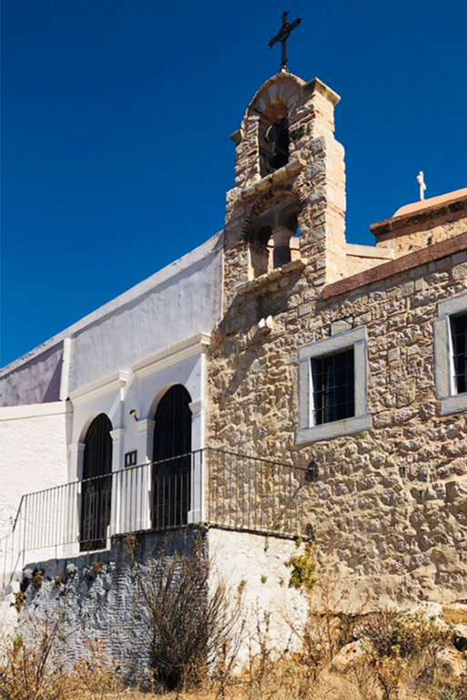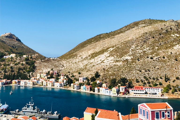 Il pomeriggio dilata i vuoti. Le persiane si socchiudono, il mare cambia gradazione, le facciate delle case rilasciano calore. Si cammina senza una direzione precisa, tra scale ripide, vicoli e cortili nascosti. Kastellorizo è un’opera d’arte urbana che non ha bisogno di pubblico né di applausi. Tra uno scorcio e un balcone fiorito affiora la sagoma del Castello dei Cavalieri, eretto anticamente per controllare la baia. È una sentinella di pietra, memoria di quando questo lembo del Dodecaneso era presidio e frontiera prima che rifugio. Oggi non reclama sguardi, ma li cattura: ricorda, sottovoce, che anche questo luogo ha avuto bisogno di difesa. La vista si apre sull’intera insenatura. Dall’alto il disegno si ricompone: molo, scogli, barche ormeggiate e una linea tesa verso la Turchia, così vicina da sembrare toccabile. Poco oltre, un sentiero conduce alla cappella di San Giorgio, bianca e raccolta, affacciata sull’acqua. È una sosta breve, un invito a prendere fiato.