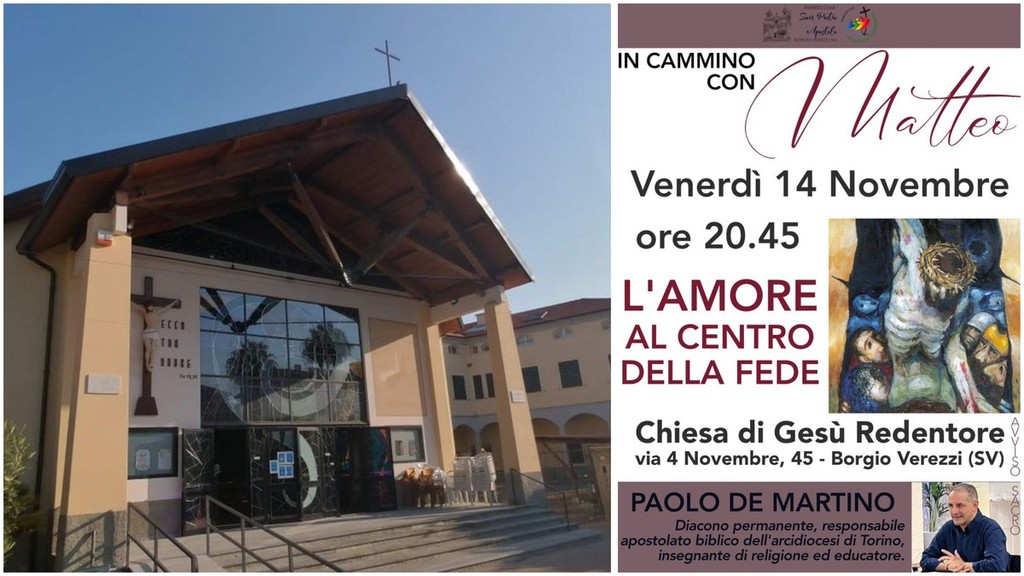 Venerdì 14 novembre a Borgio Verezzi, alle ore 20.45, presso la chiesa di Gesù Redentore in Via 4 Novembre 45, si terrà l’incontro “In cammino con Matteo – L’amore al centro della fede”.