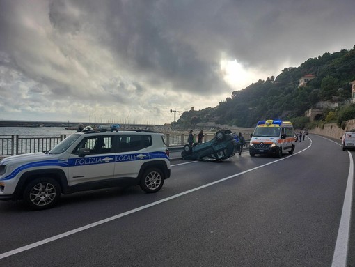 Momenti di grande spavento nel pomeriggio odierno, poco dopo le 15, lungo la Ss1 Aurelia tra il porticciolo di Finale Ligure e Varigotti dove un'auto è sbandata finendo per cappottarsi.