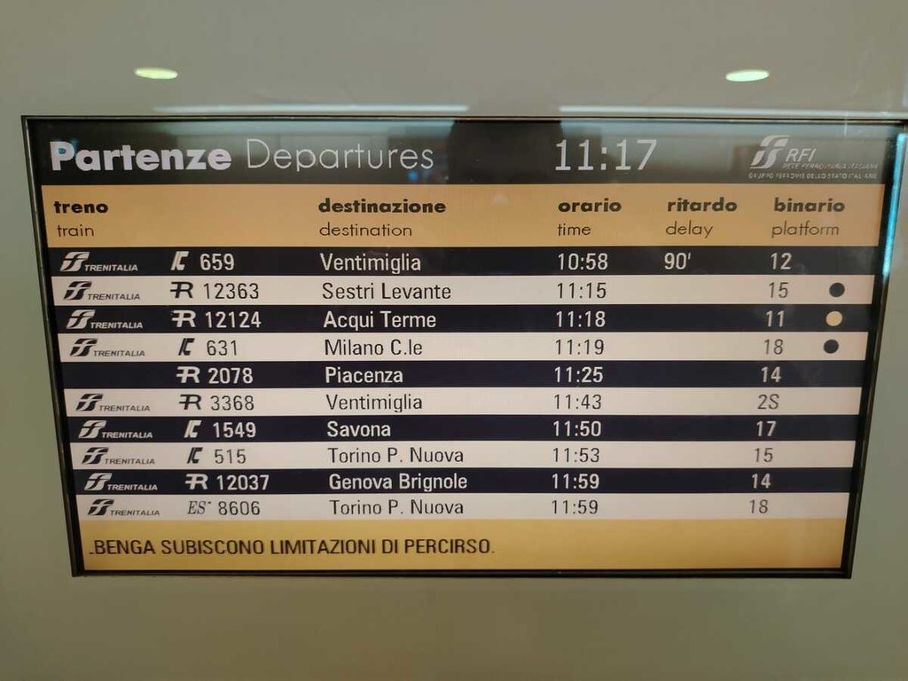 A causa di un inconveniente tecnico alla linea elettrica ferroviaria all’altezza di Spotorno, il treno Intercity IC 659, previsto in partenza da Genova per Ventimiglia alle 10.58, registra un ritardo di circa 90 minuti.